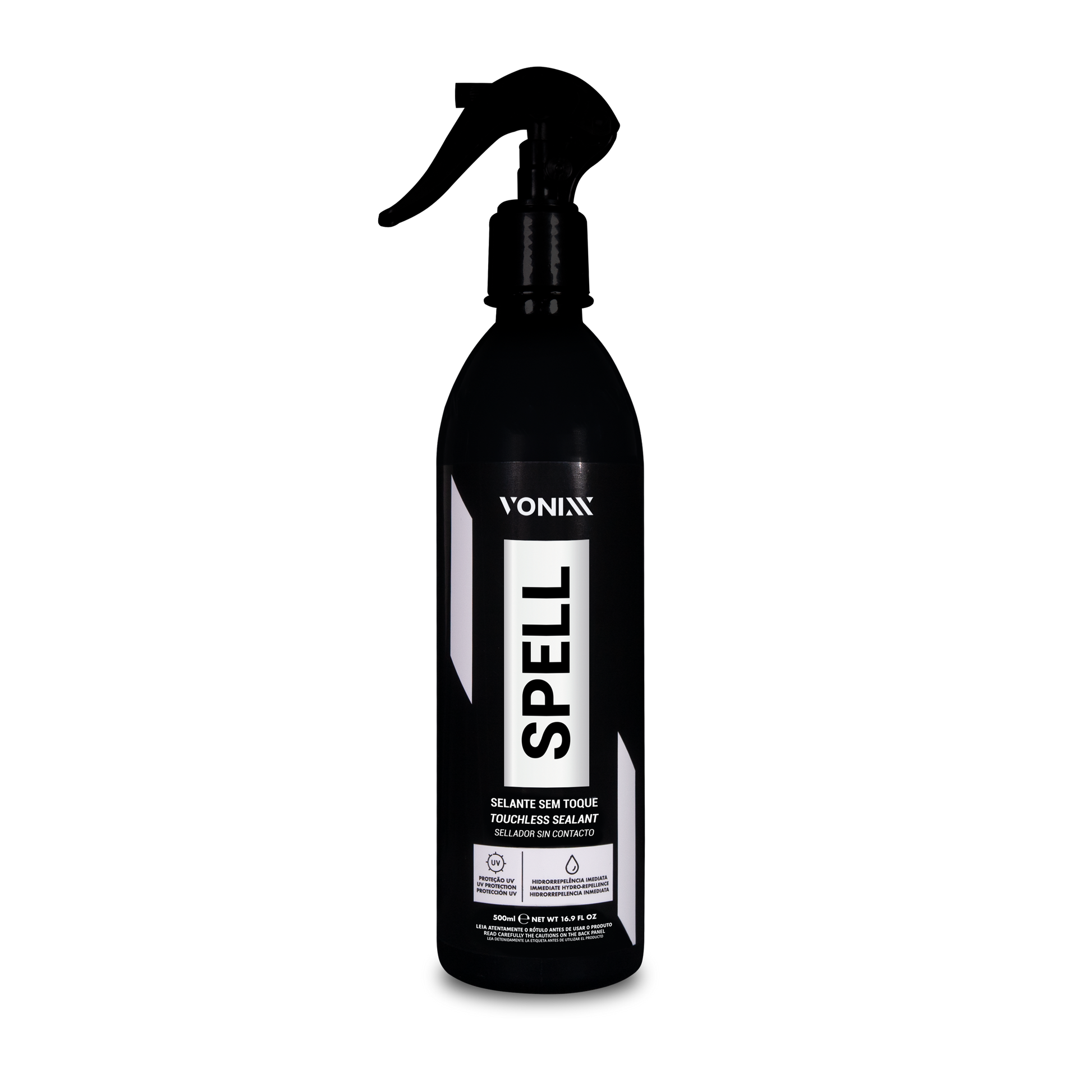 Spell is a touchless silica-based sealant that acts immediately upon application. Its new formula was developed to achieve greater stability, increasing the water repellency and protection offered by the product. Spell promotes immediate water repellency, creating a film of shine and UVA and UVB protection on paintwork, plastics, glass and wheels.